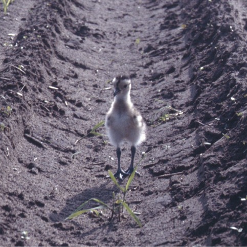 Zwei Tage altes Brachvogelküken auf seinem Acker. Leider verhungerten die jungen Küken, weil es keine Nahrung auf den Äckern gab und der Gelegeschutz wurde daraufhin eingestellt.