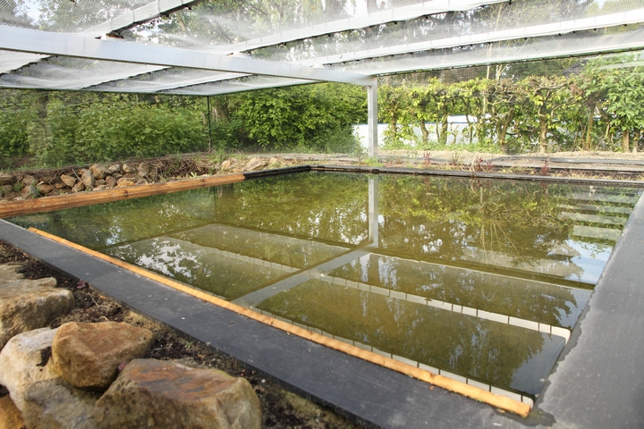 Glaswände und ein Dach aus Fliegendraht halten jeden Fressfeind von den Kaulqappen im neuen Aufzuchtbecken fern.