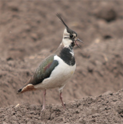 Ein Kiebitz warnt sein Küken vor dem herannahenden Traktor.