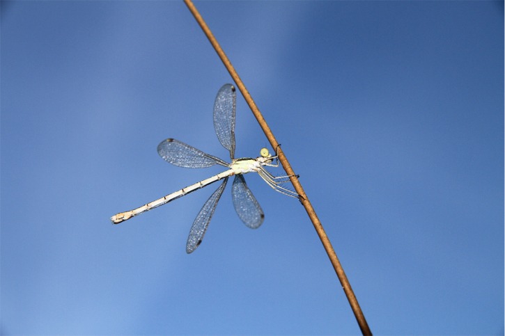Eine Libelle wartet auf die ersten Sonnenstrahlen, damit der Tau der Nacht trocknet.